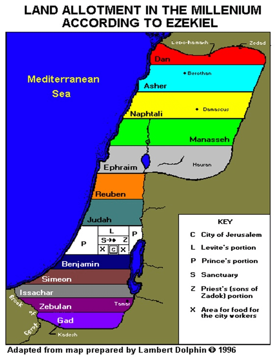 In the Millennium, 13 tribes will inherit a parcel of land. The portion given to the tribe of Levi is called a holy section. It will be a parcel 50 miles by 50 miles and will be situated between the land inheritance given to Judah and Benjamin. Both the city of Jerusalem and the Temple will be in this section of land, called the “sacred district” As described in Ezekiel 45, the land around the Temple is divided into three large parcels of land – The Sanctuary, open space around it and homes for the Levite priests.